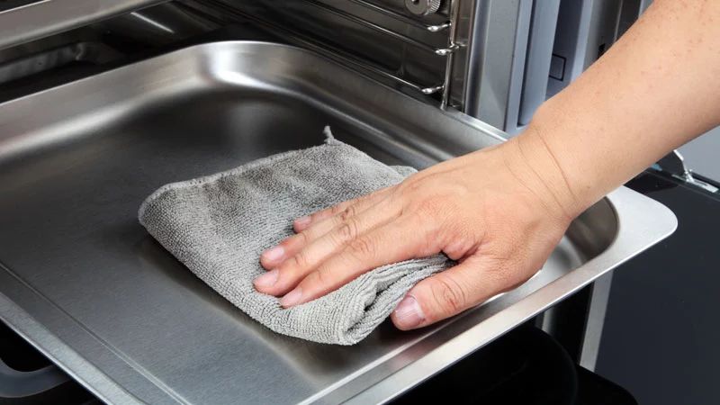 每次烹飪完,須及時用柔軟抹布擦干內(nèi)膽、門體及冷凝水槽內(nèi)的殘留的冷凝水,如果烹飪過程中有在內(nèi)膽產(chǎn)生凝結物,還需要使用海綿或吸濕力強的軟布蘸取中性洗滌劑加溫水的混合溶劑來抹去內(nèi)膽內(nèi)壁的凝結物。