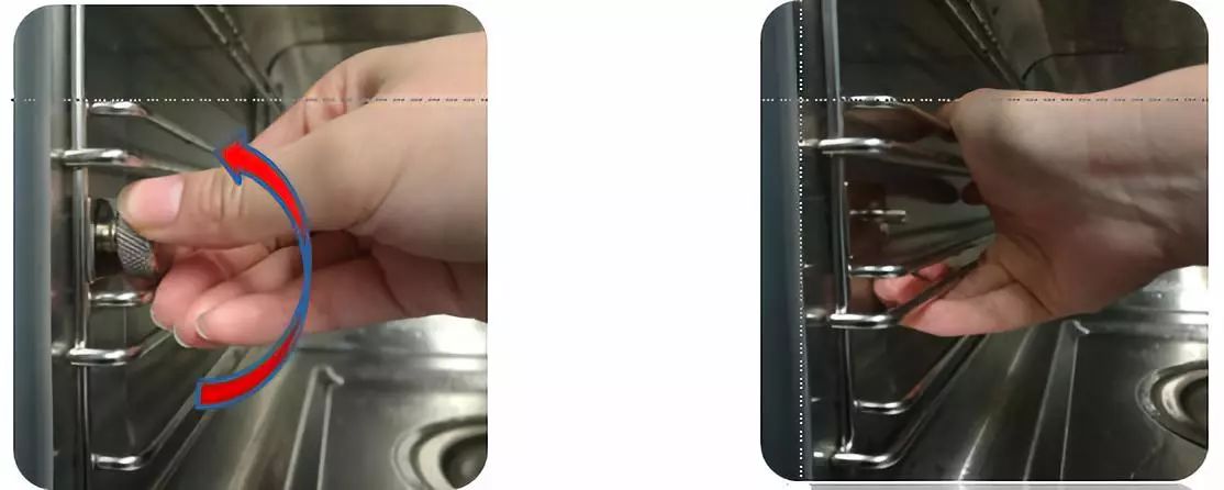 溫馨提示:清潔內(nèi)膽前,先取出兩邊的側支架(將兩邊固定的旋鈕擰下即可取下支架),清潔會更容易。關上蒸箱門前,確保內(nèi)膽已完全干透。